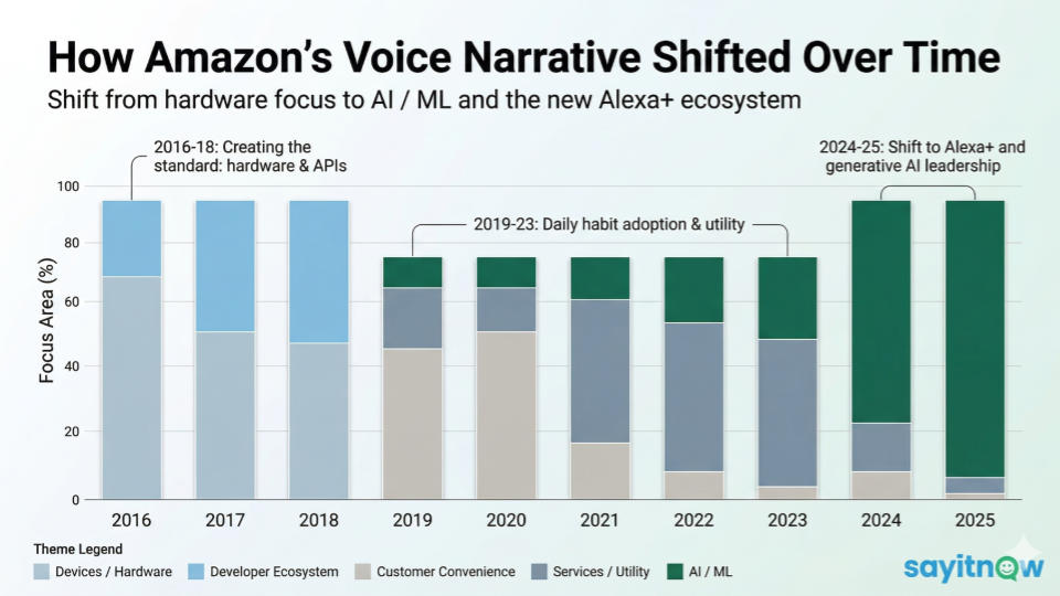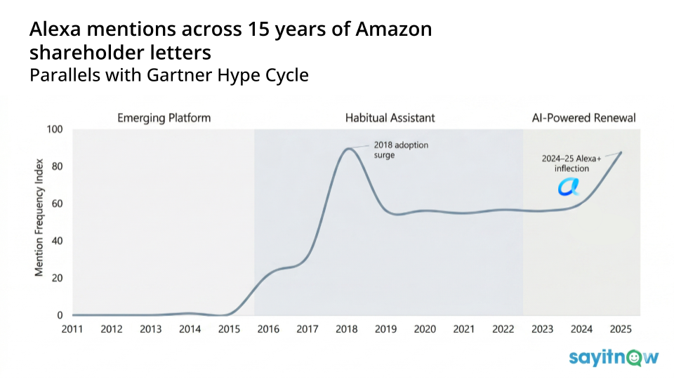 Alexa mentions rose sharply from 2016, peaking in 2018, then re-emerging with renewed strategic weight in 2024 and 2025 around Alexa+, positioned as a much more capable assistant, with Amazon linking it directly to deeper customer relationships, higher engagement, and future growth.