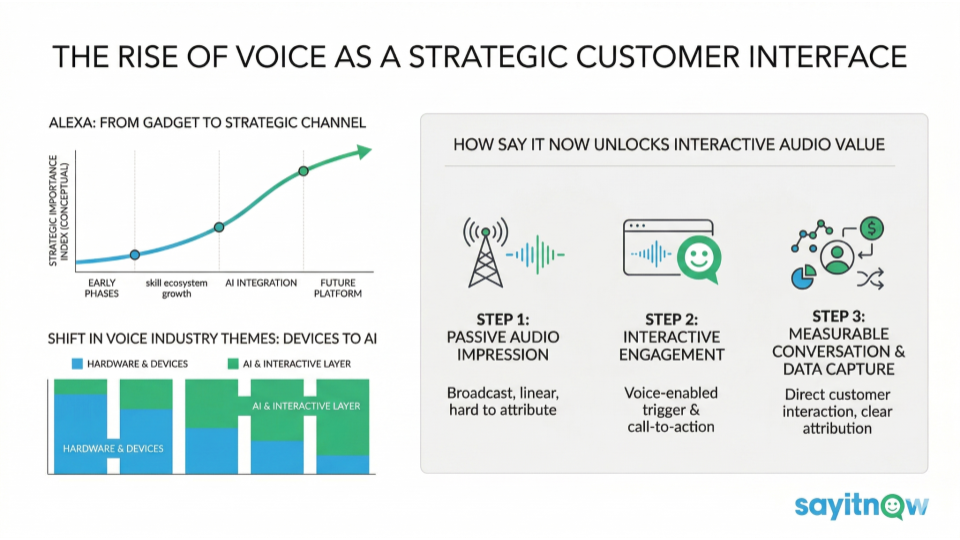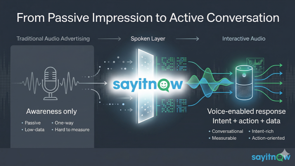 If consumers are increasingly comfortable responding, exploring and acting through voice, then audio and TV no longer have to stop at awareness, it can become interactive, measurable & actionable.